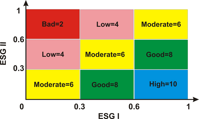 ESG I=(60x1)+(10x0.8)+(10x0.6)=74, ESG II=(35x0.8)+(10x1)=38