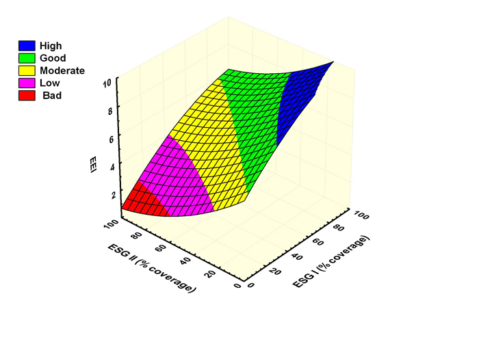 EEIEQR values for coastal waters in Greece higher than 0.48 (±0.09SD) indicate sustainable ecosystems of good or high ESC, whereas EEI values lower than 0.48 indicate that the ecosystems should be restored to a higher ESC.