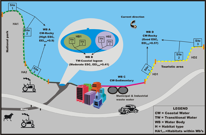 A hypothetical coastal zone was divided into four water bodies (WB): two coastal (A, D) with hard substrata, one coastal ( C) and one transitional (B) with a sedimentary substratum (see Figure).