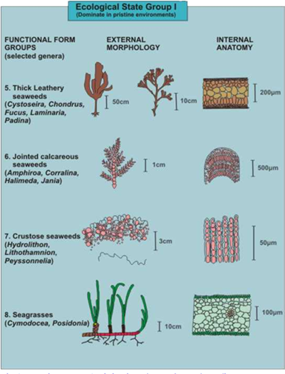 By studding morphological (external morphology, internal anatomy, texture), physiological (surface area/volume ratio, photosynthetic/non-photosynthetic ratio, photosynthetic performance, growth, light adaptation) and life history (longevity, succession) traits along with distributional data across eutrophication gradients two main groups of coastal water macroalgae were identified: the slow-growing, late-successional species (ESG I) and the fast-growing, opportunistic species (ESG II). Those groups were hierarchically divided into three and two sub-clusters, respectively: